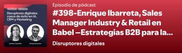 En este artículo os dejo la entrevista que me hicieron en el Podcast Disruptores Digitales en Abril de este año. Fue una experiencia super divertida y tuve la oportunidad de poder hablar de mi experiencia en Ventas, de acciones de generación de demanda que me han funcionado, de otras que no, así como cuál es mi forma de aproximación a los clientes con las famosas 'balas de plata'. También comparto personas, libros y podcast que a mí me han inspirado, así como herramientas que utilizo para la venta.